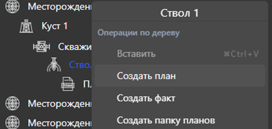 Для создания объекта плановой траектории (плана) следует воспользоваться контекстным меню ствола и выбрать пункт «План» (Рисунок 13).