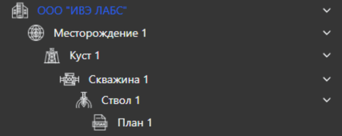 Существует семь уровней иерархии: Компания, Месторождение, Куст, Скважина, Ствол, План/Факт и отдельный уровень - Папка, в которой может находиться группа элементов одного уровня.
