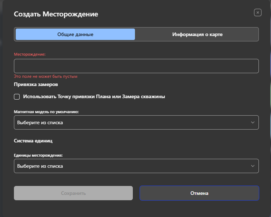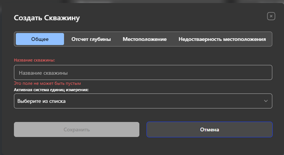 На вкладке «Общее» указывается основная информация о скважине: название. На вкладке «Отсчет глубины» задается альтитуда и тип скважины. На вкладке «Местоположение» задаются координаты местоположения устья скважины.