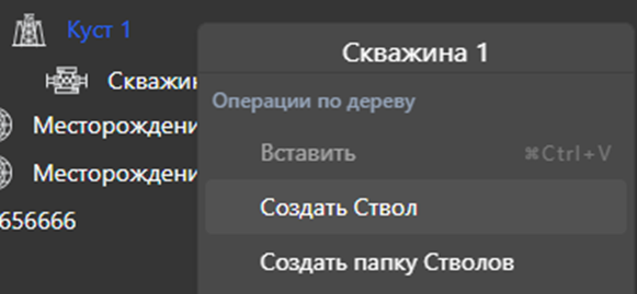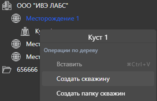 Для создания объекта скважины необходимо воспользоваться контекстным меню куста (Рисунок 9) и выбрать пункт «создать Скважину».