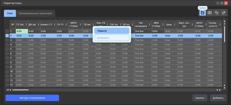 Заводятся интервалы плана профиля скважины по разным методам посредством области «Методы планирования», которая появляется при активации любой строки таблицы или при нажатии на кнопку «Методы планирования», причем если строка заполнена, то ее данные открываются в соответствующем методе.