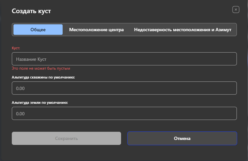 На вкладке «Общее» указывается основная информация о кусте: название и задается альтитуда скважин по умолчанию. На вкладке «Местоположение центра» задаются координаты центра куста.