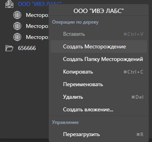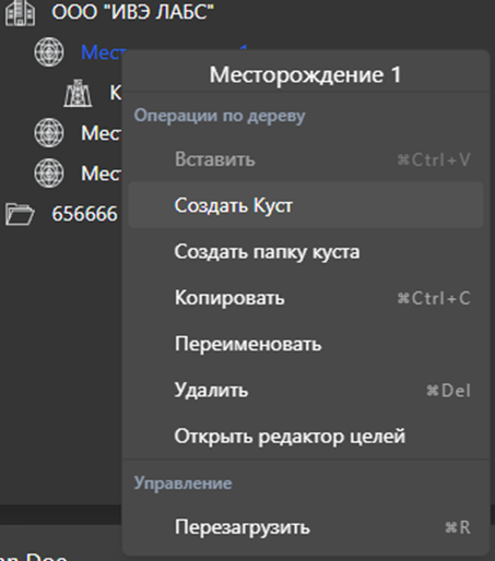 Для создания объекта Куста необходимо воспользоваться контекстным меню месторождения (Рисунок 7) и выбрать пункт «создать Куст».