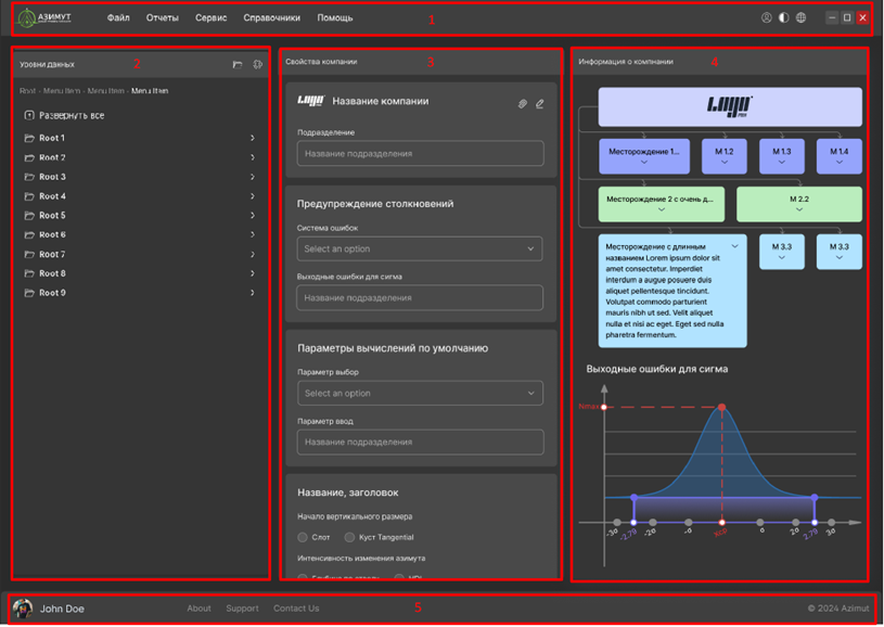 Основное окно приложения – это главный экран, который состоит из верхней части, в которой располагается главное меню (1), области дерева иерархии данных (2), области свойств (3), графической области (4) и нижней части «подвал» (5), представленные на рисунке 1. При выборе любого уровня иерархии информация об этом уровне отображается сразу в области свойств и графической области. При увеличении главного экрана расширяется графическая область.