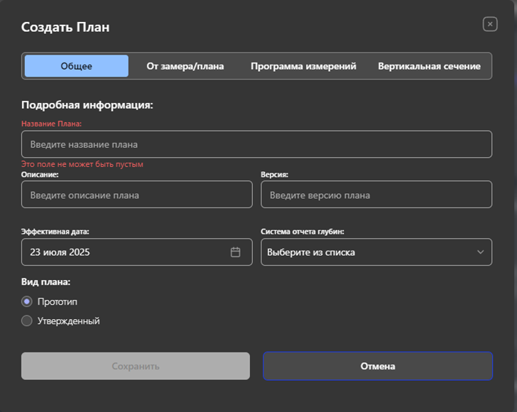 На вкладке «Общее» указывается основная информация о плане: название, Описание, Версия, Эффективная дата. На вкладке «От замера/плана» задаются точки привязки бокового ствола.